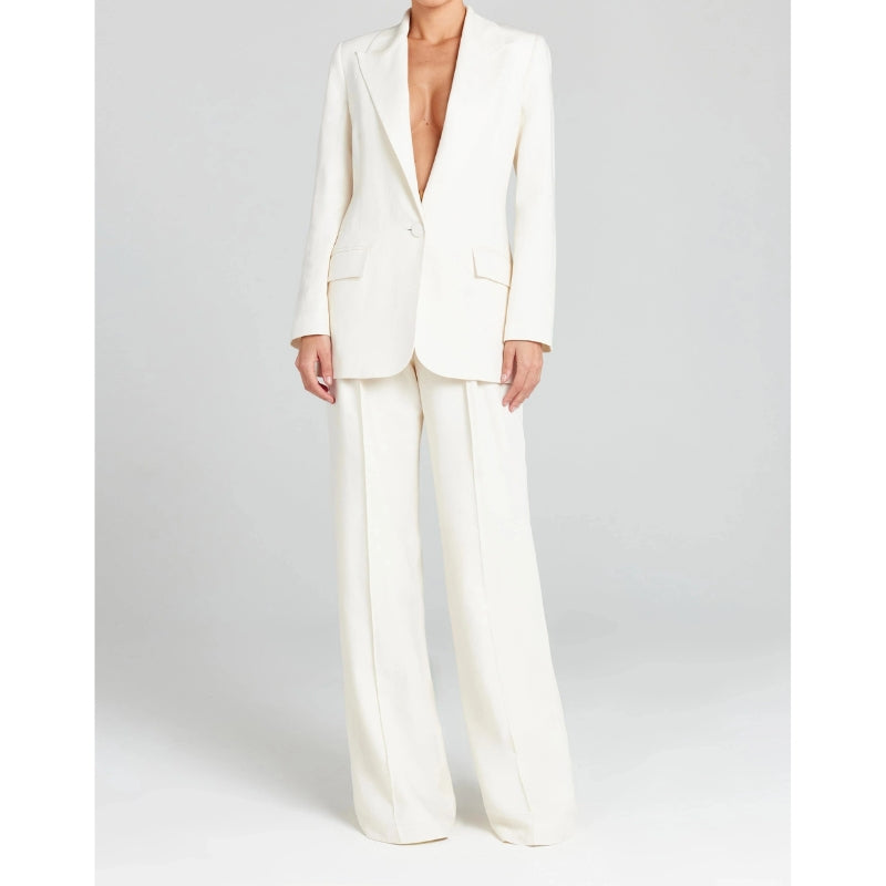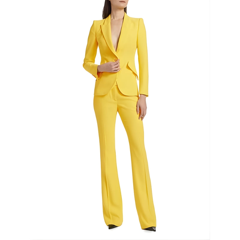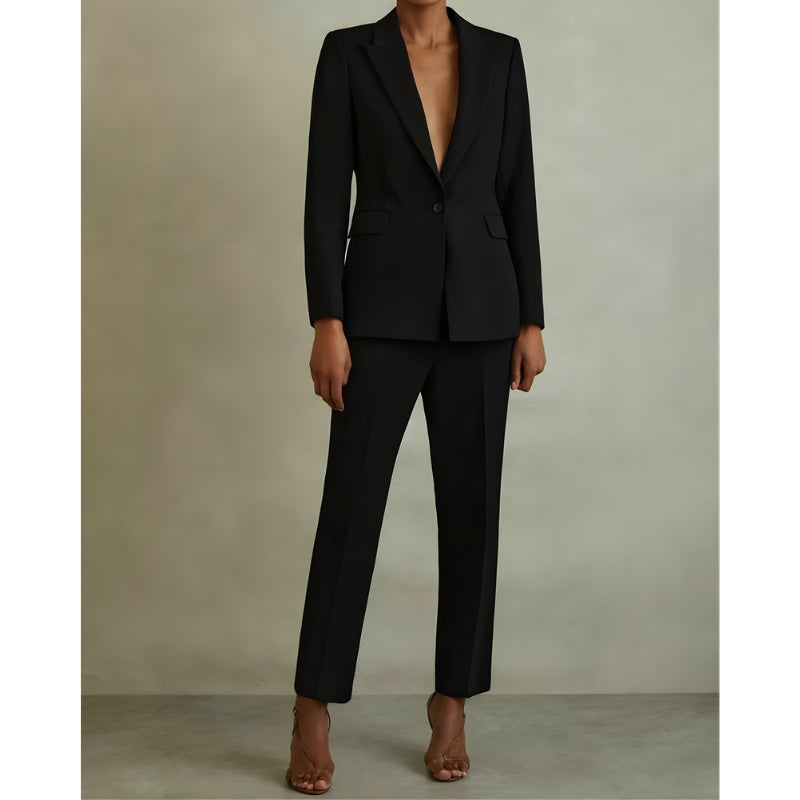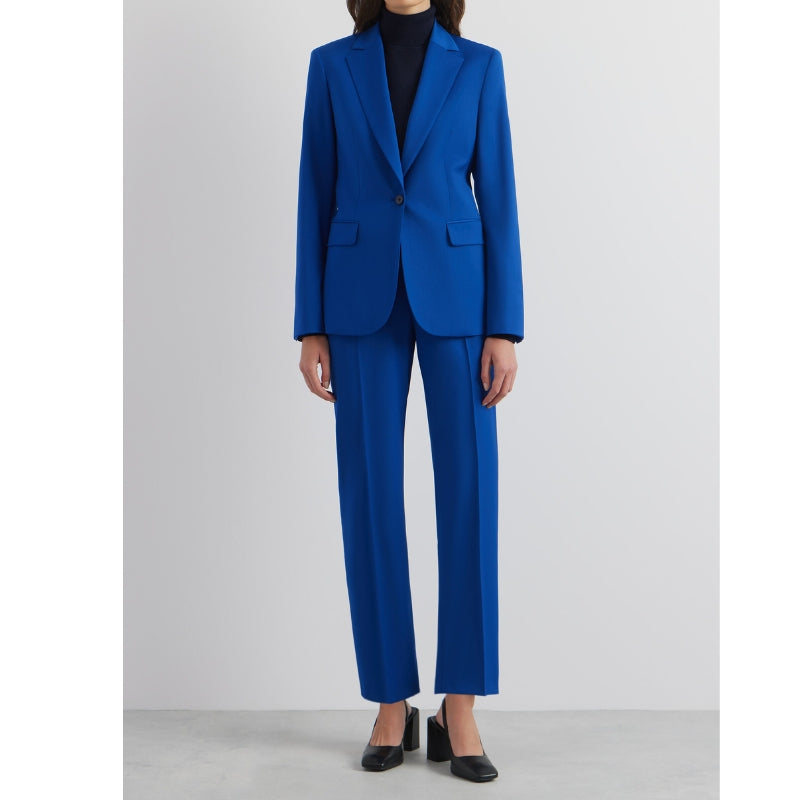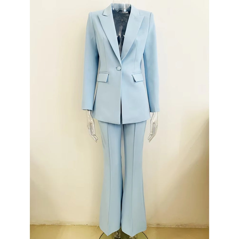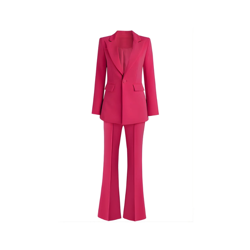 Dit tweedelige kostuum bestaat uit een jasje met bijpassende broek met wijde, rechte pijpen. Het jasje sluit met één knoop ter hoogte van de taille en heeft aan beide zijden klepzakken. De broek valt recht vanaf de heup en reikt tot over de schoenen.