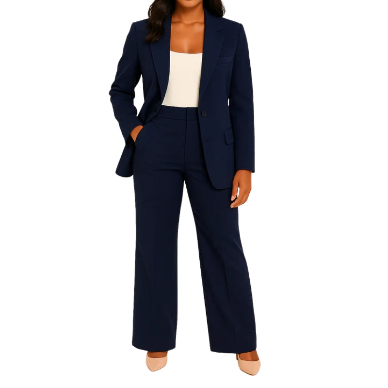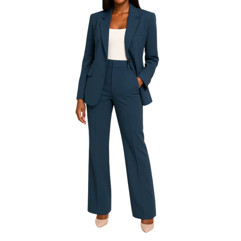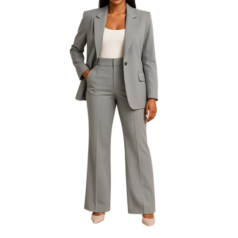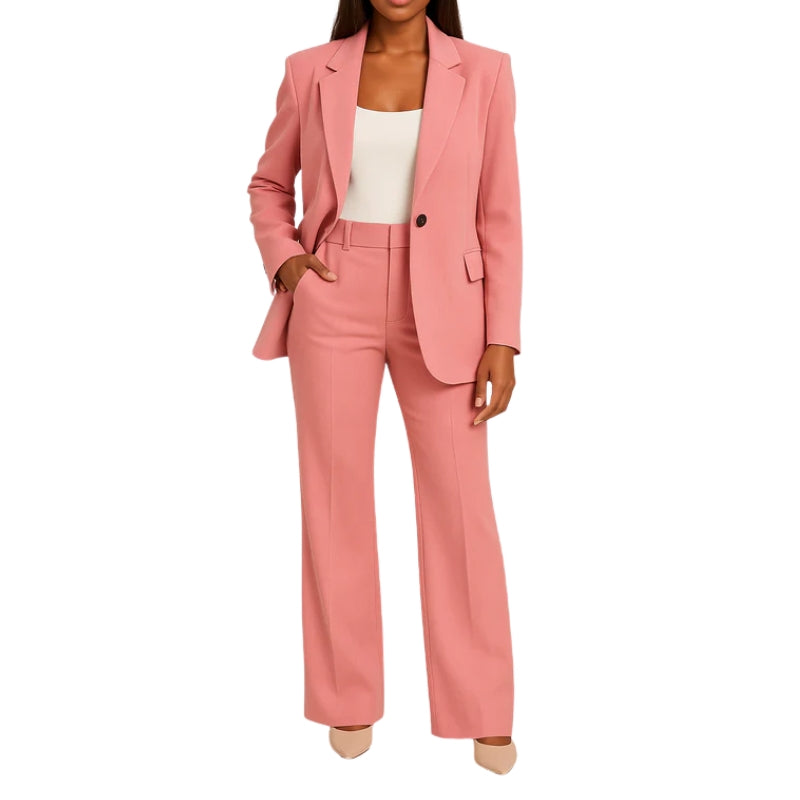 Dit pak bestaat uit een getailleerd jasje met kraag, gesloten met één knoop aan de voorkant. Het jasje heeft ingewerkte zakken aan de zijkanten en lange mouwen met knoopsluiting aan de manchetten. De bijpassende broek heeft een hoge taille, wijde pijpen die tot op de grond vallen en aan beide zijden zijzakken.