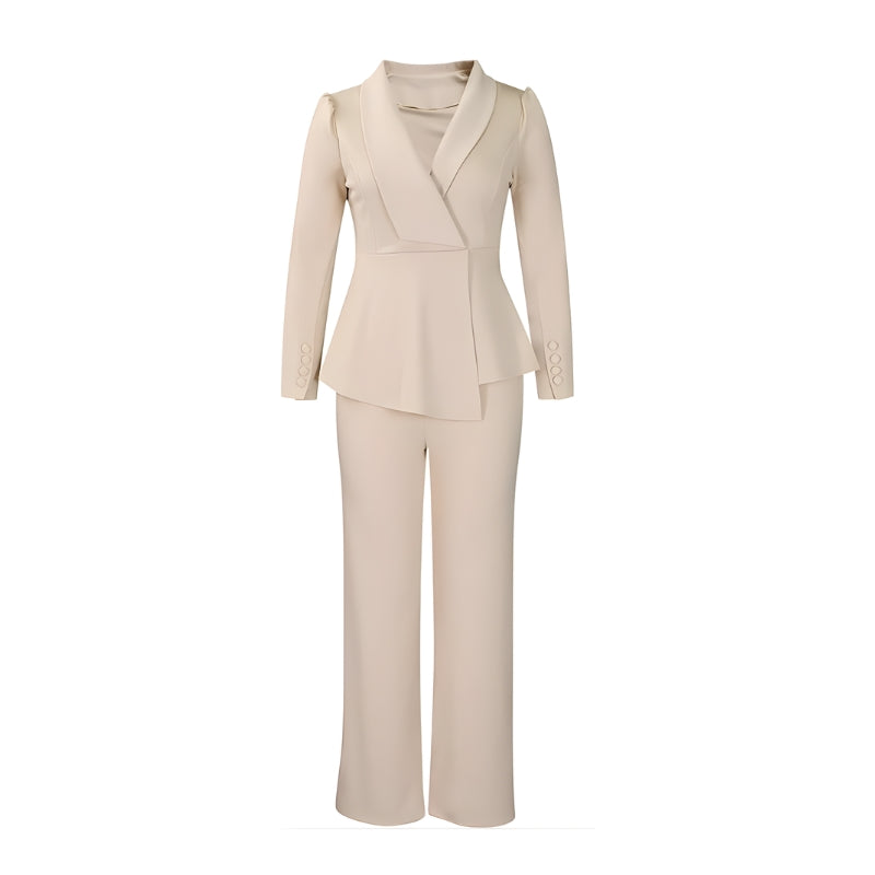 Dit tweedelige kostuum bestaat uit een jasje met een brede sjaalkraag en een asymmetrische peplum die vanuit de taille uitloopt. Het jasje heeft schoudervullingen en sluit zonder zichtbare knopen. De bijpassende broek heeft een rechte, smalle pasvorm en valt tot op de enkels.