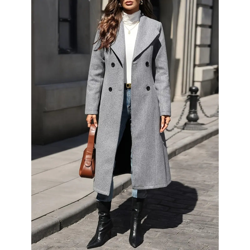 Lange jas met twee rijen knopen en brede revers