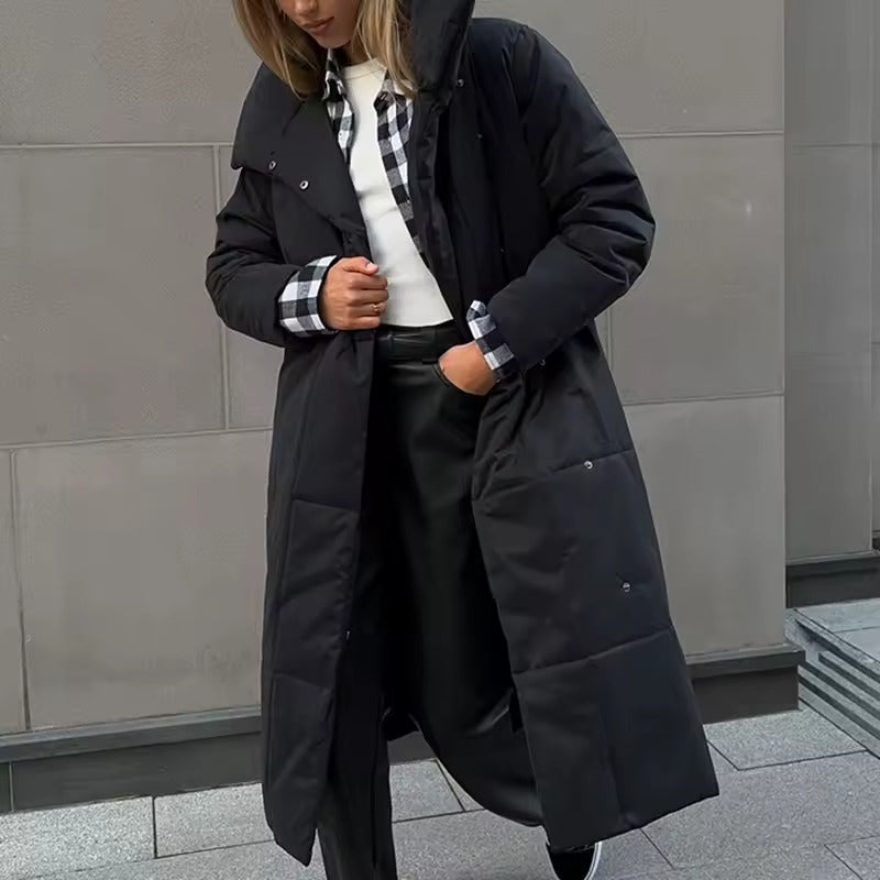 Dames lange gewatteerde winterjas met riem en knopen aan de voorkant
