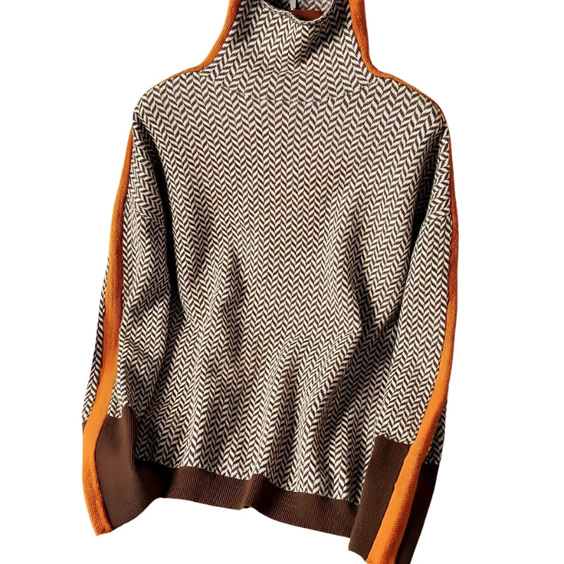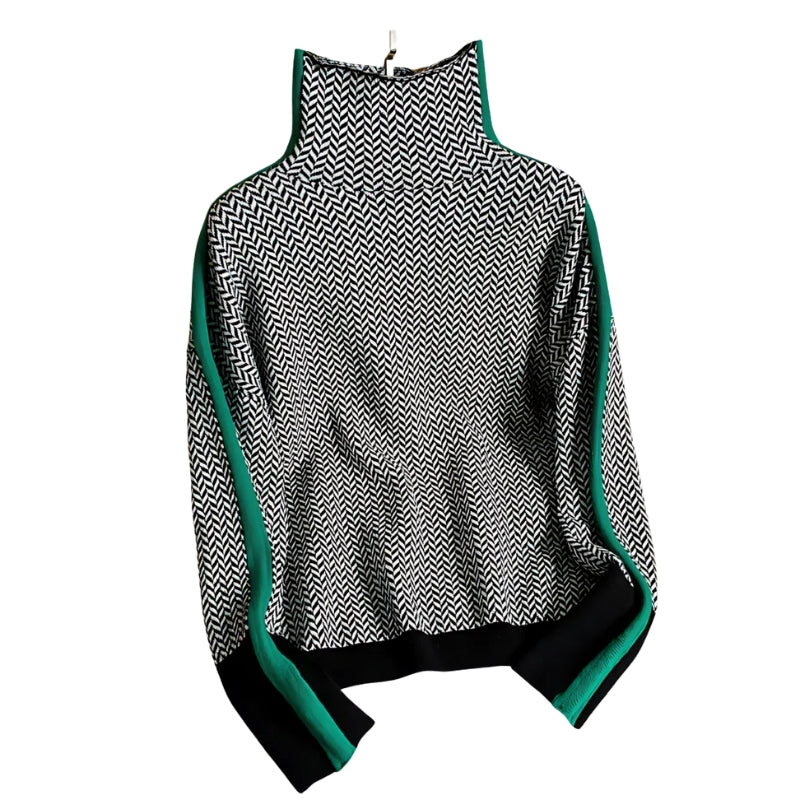 Deze damestrui heeft een opstaande col die dubbel kan worden omgeslagen. Het zigzagpatroon loopt over het hele oppervlak, gecombineerd met brede banen langs de mouwen en zijkanten. De manchetten en zoom zijn afgewerkt met effen boorden die het patroon accentueren.