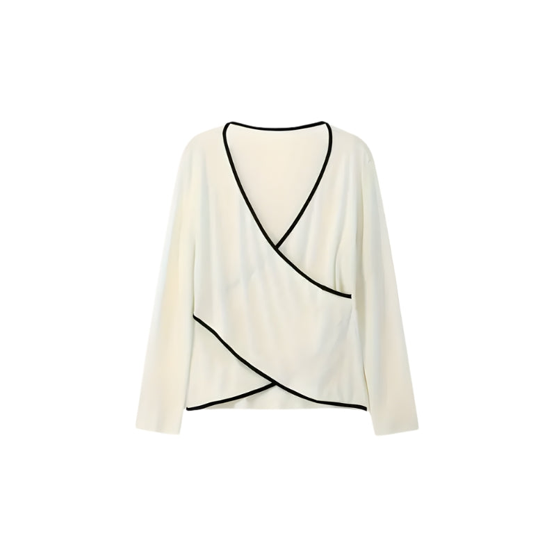 Deze blouse heeft een wikkelstijl met een diepe V-hals en een overslag aan de voorkant. Langs de randen van de overslag en V-hals loopt een bies. De blouse heeft lange mouwen en valt asymmetrisch aan de voorkant.