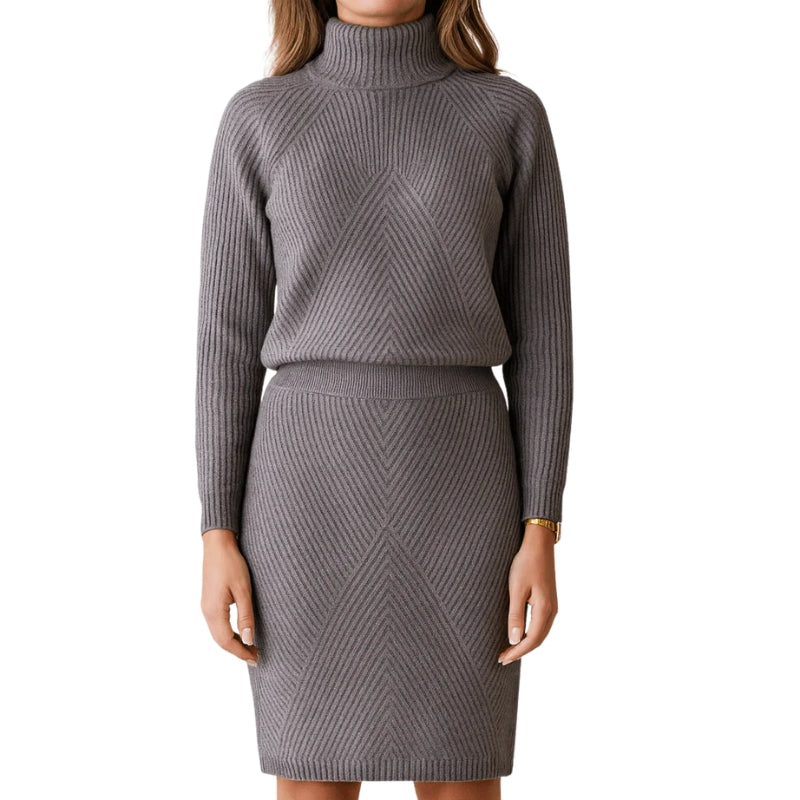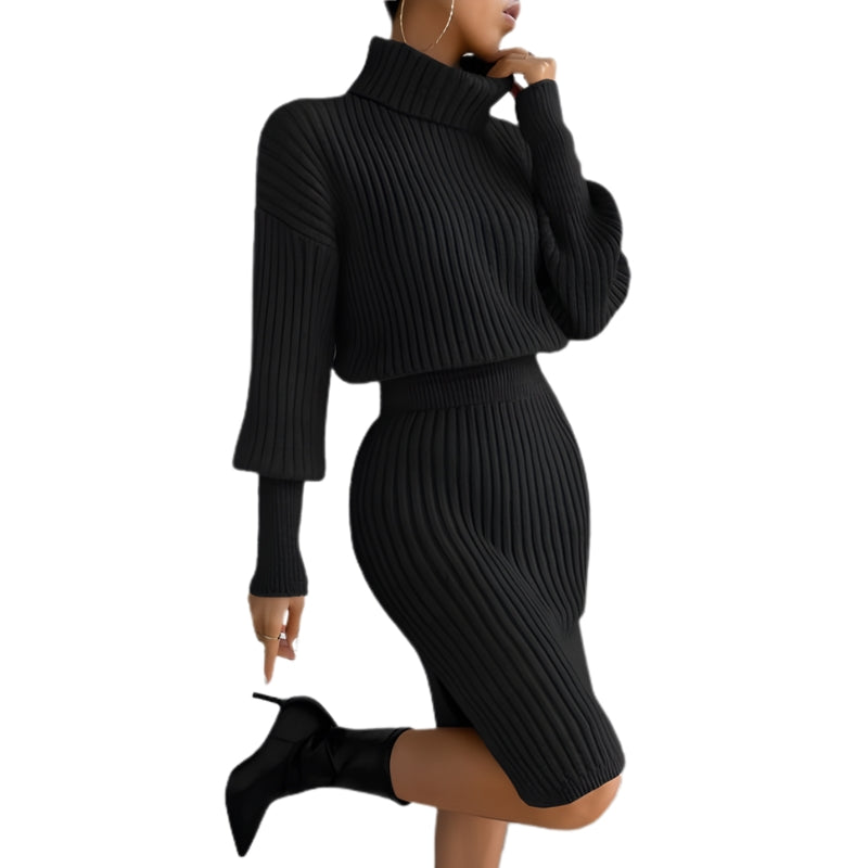 Deze gebreide damesjurk bestaat uit een top met col en een aansluitende rok in dezelfde stijl. Het kledingstuk heeft lange mouwen en een hoge opstaande kraag met een geribbeld patroon in diagonale lijnen. De rok volgt hetzelfde patroon en valt tot aan de knie, geschikt voor dagelijks dragen of informele gelegenheden.