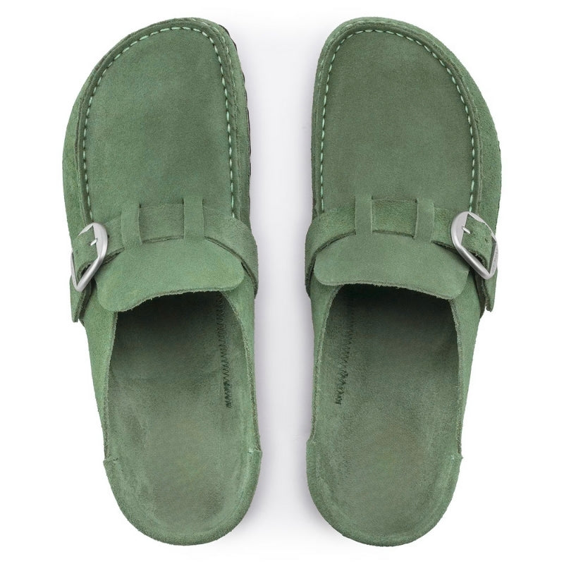 Deze instappers hebben een gesloten neus en een open hiel. Over de wreef loopt een band met een gespsluiting, terwijl de bovenzijde is afgewerkt met een omgeslagen rand rondom de opening. Het schoeisel is voorzien van stiknaden langs de randen en heeft een platte zool met een rand aan de onderzijde.