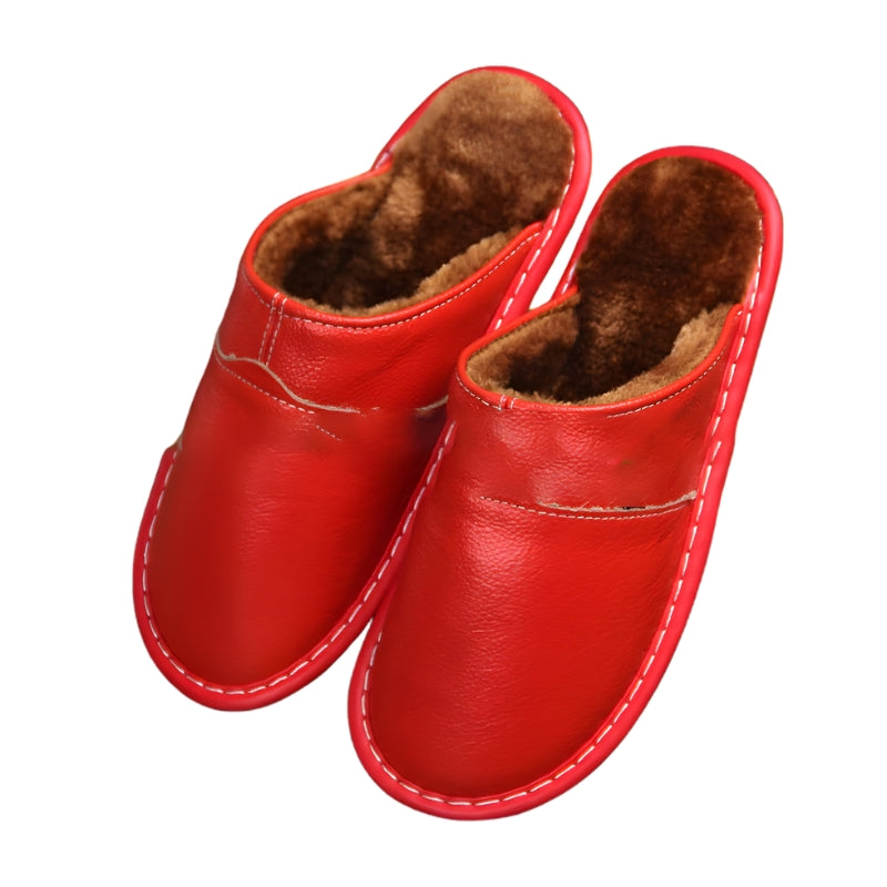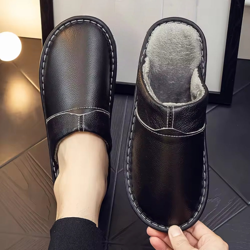Deze instapschoenen hebben een gesloten, ronde neus en een open hiel, waardoor ze ook als pantoffels gedragen kunnen worden. De binnenzijde is afgewerkt met een zachte, pluizige voering die aan de bovenrand zichtbaar is. Op de wreef bevindt zich een verstelbare gesp en de zool heeft een lichte ronding.