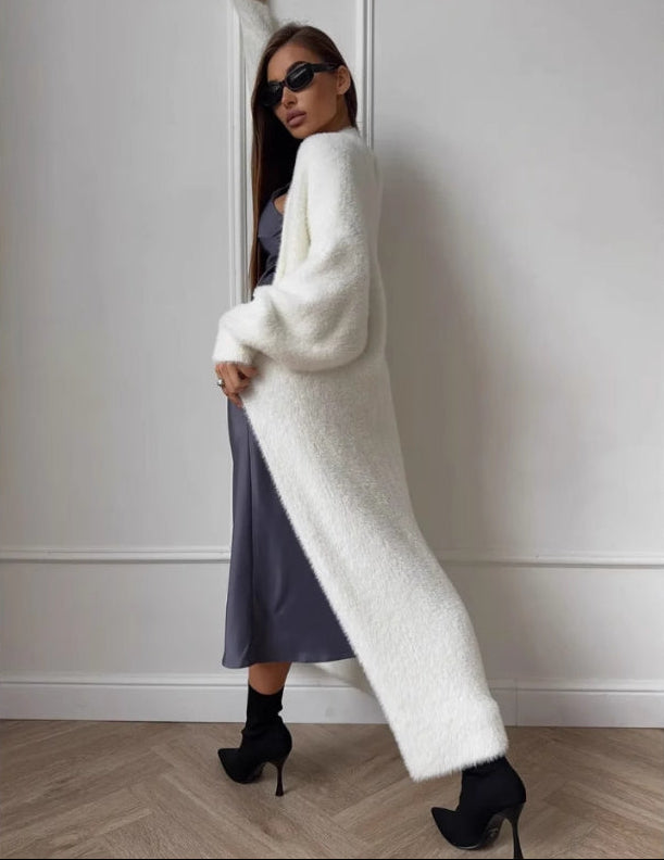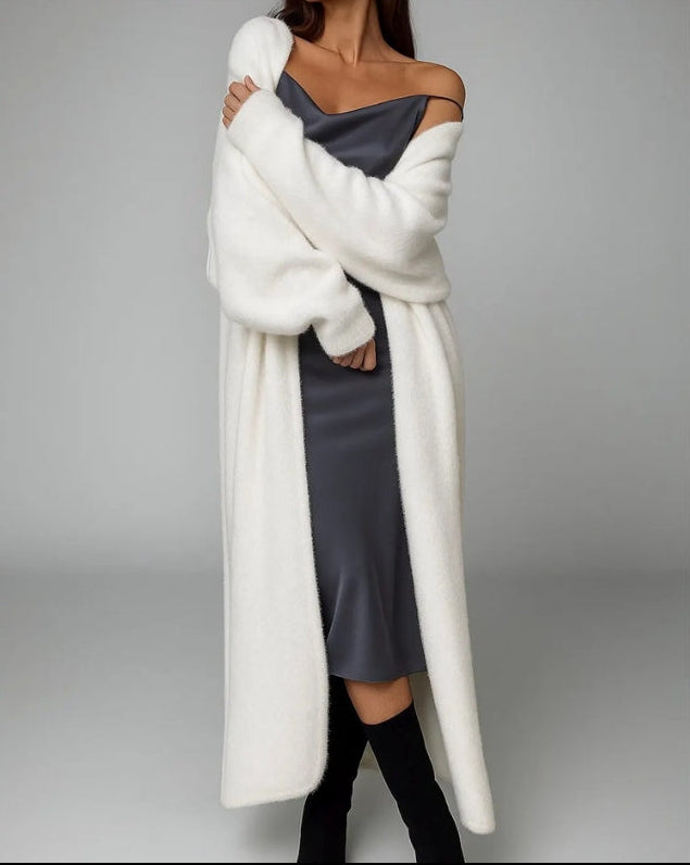 Dit vest heeft een lange pasvorm die tot over de knieën valt en blijft open aan de voorkant zonder sluiting. Rond de taille bevindt zich een ceintuur die gestrikt kan worden om het vest op zijn plaats te houden. De mouwen zijn lang en wijd gesneden, en het vest kan over de schouders gedragen worden of losjes om het lichaam vallen.