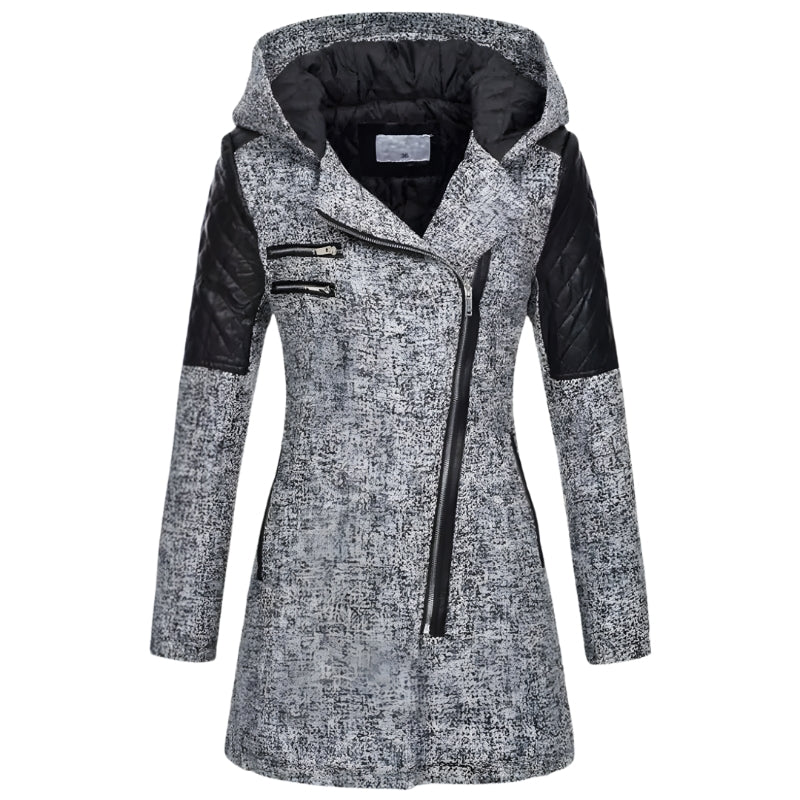 Deze jas heeft een schuine ritssluiting die schuin over de voorkant loopt en met drukknopen wordt afgesloten. De kap is gevoerd en kan worden aangepast met een koordsluiting. De schouders en bovenste mouwen hebben doorgestikte vakken die afsteken bij de rest van het kledingstuk.