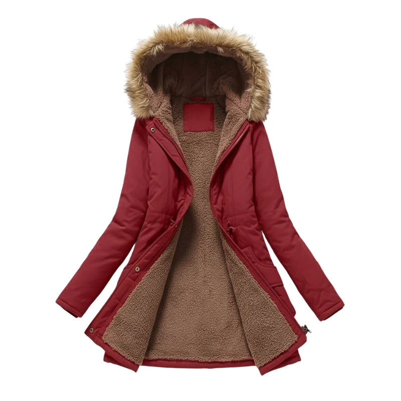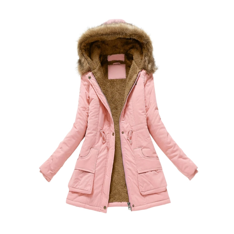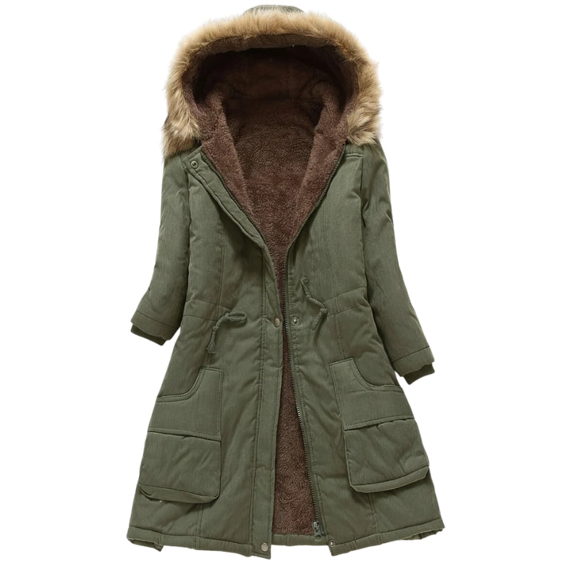 Deze overjas heeft een geïsoleerde binnenzijde die doorloopt tot in de capuchon. De jas sluit met een ritssluiting en is voorzien van een trekkoord in de taille. Aan de voorzijde bevinden zich vier zakken, waarvan twee met een klep in het onderste gedeelte.