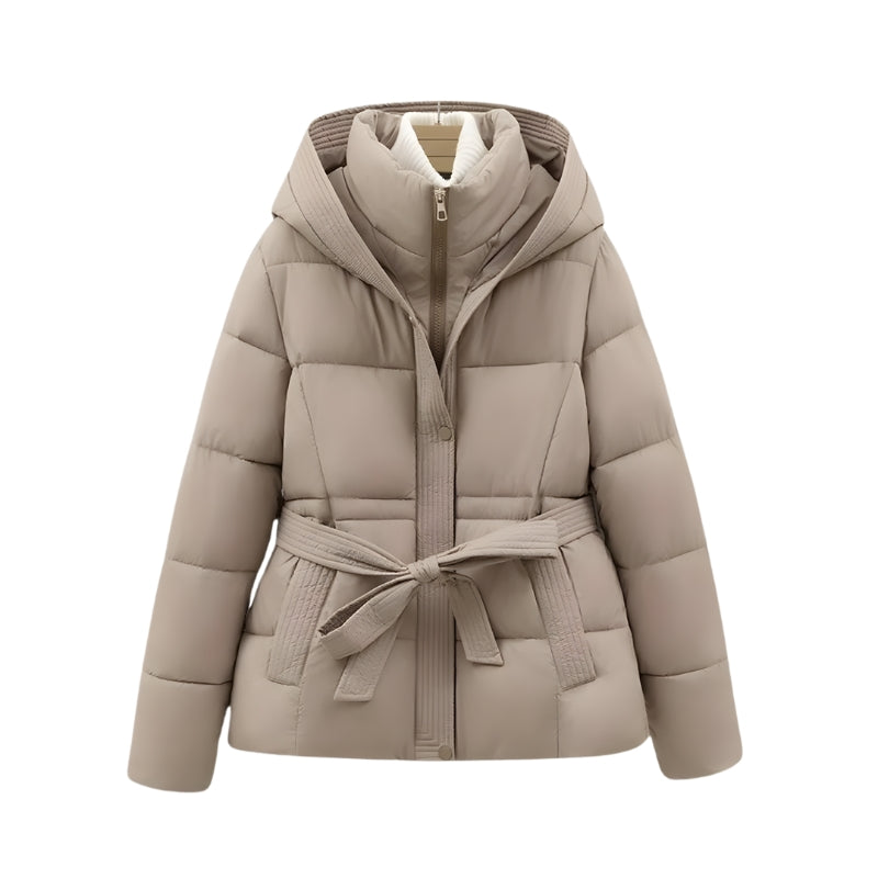 Deze jas heeft een horizontaal stikselpatroon. De jas is voorzien van een afneembare capuchon en een hoge, opstaande halslijn. Een strikceintuur in de taille maakt het mogelijk om de pasvorm aan te passen. De jas sluit aan de voorzijde met een ritssluiting en drukknopen.