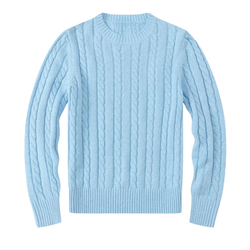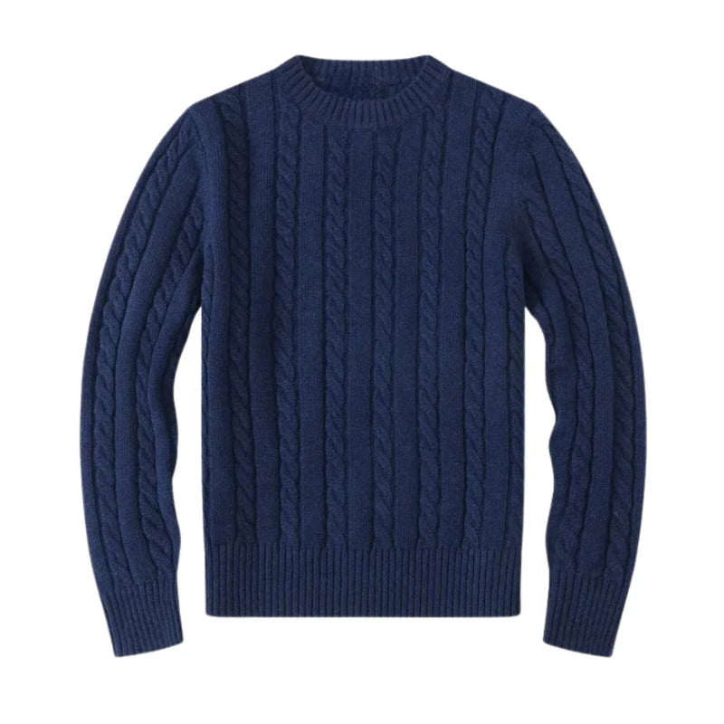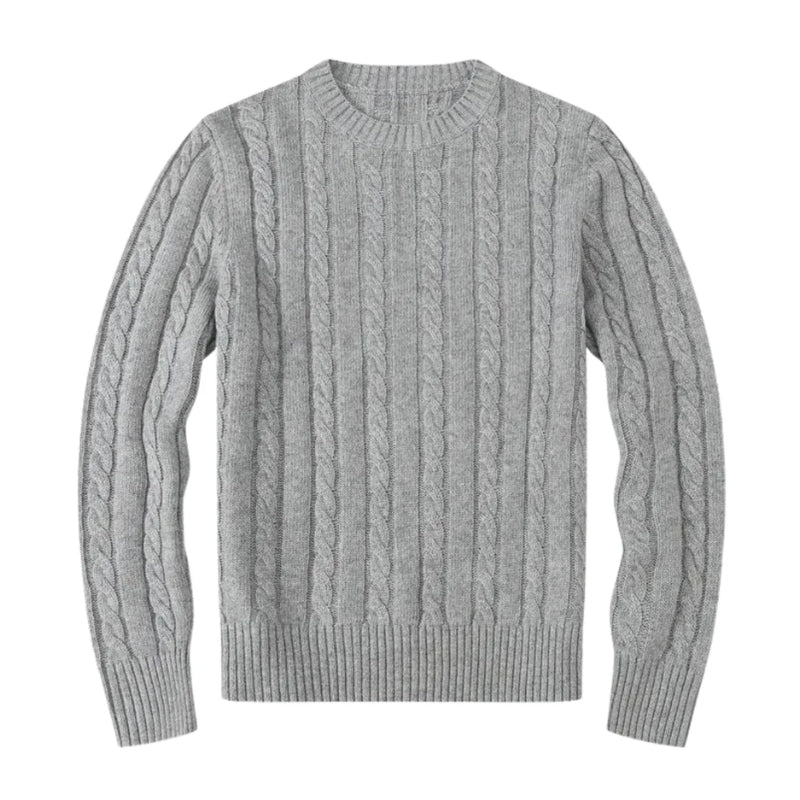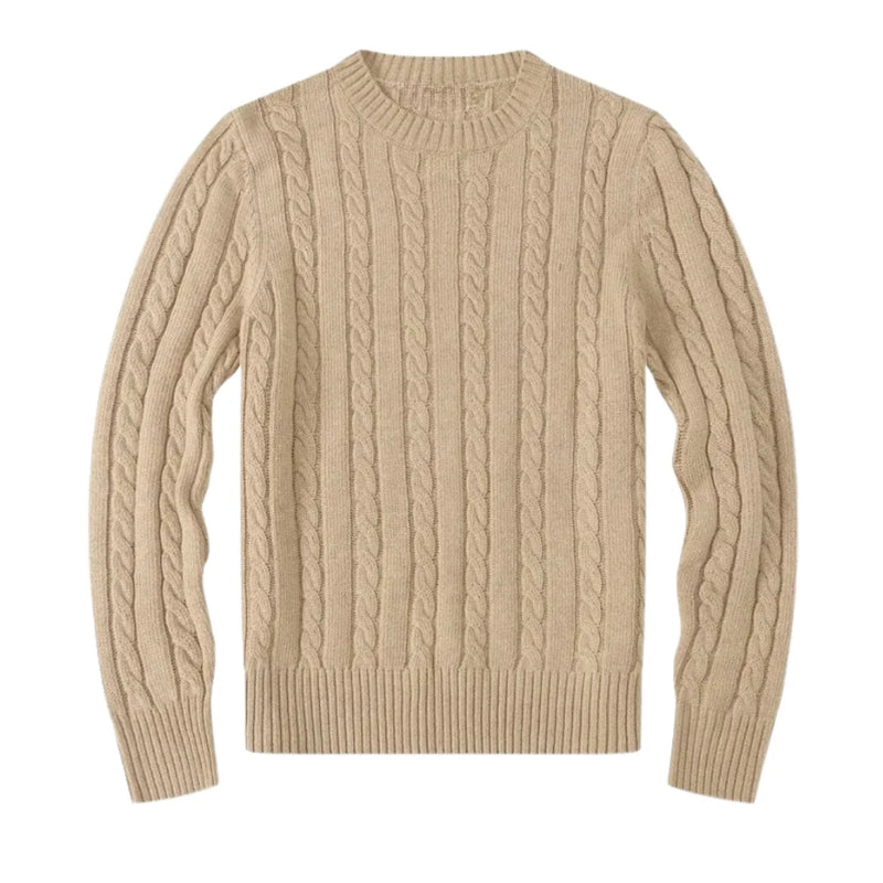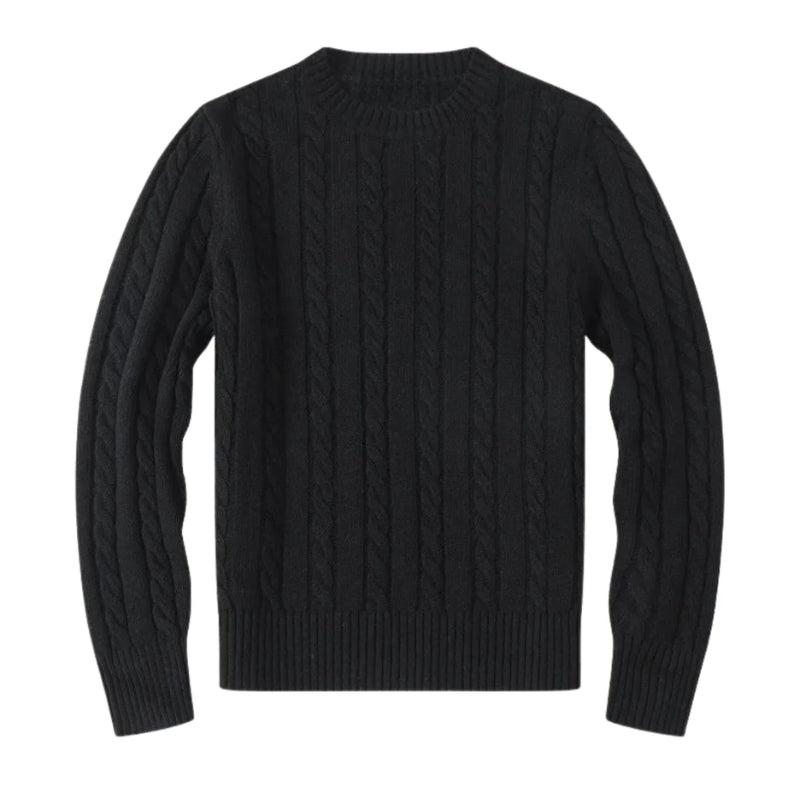 Deze herentrui heeft staande kabels die over de gehele trui lopen. De hals is rond afgewerkt met een geribbelde boord. De lange mouwen hebben kabels die langs de lengte van de armen lopen en eindigen met geribbelde boorden. De onderzoom heeft een geribbelde afwerking die bij de taille sluit.