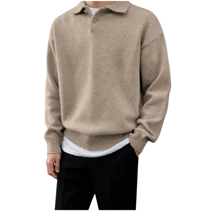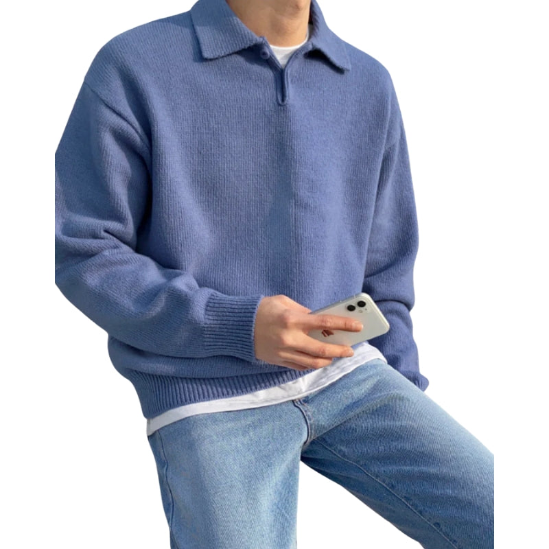 Deze gebreide trui heeft een opstaande kraag met een korte knopenrij van ongeveer twee tot drie knopen aan de voorkant. Het fijngebreide weefsel loopt over het gehele bovenstuk. De lange mouwen eindigen in geribbelde boorden aan de polsen. De onderzoom heeft ook een geribbelde afwerking.