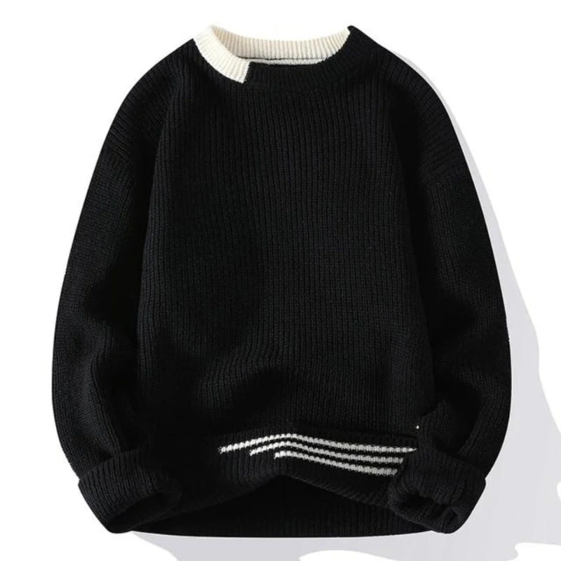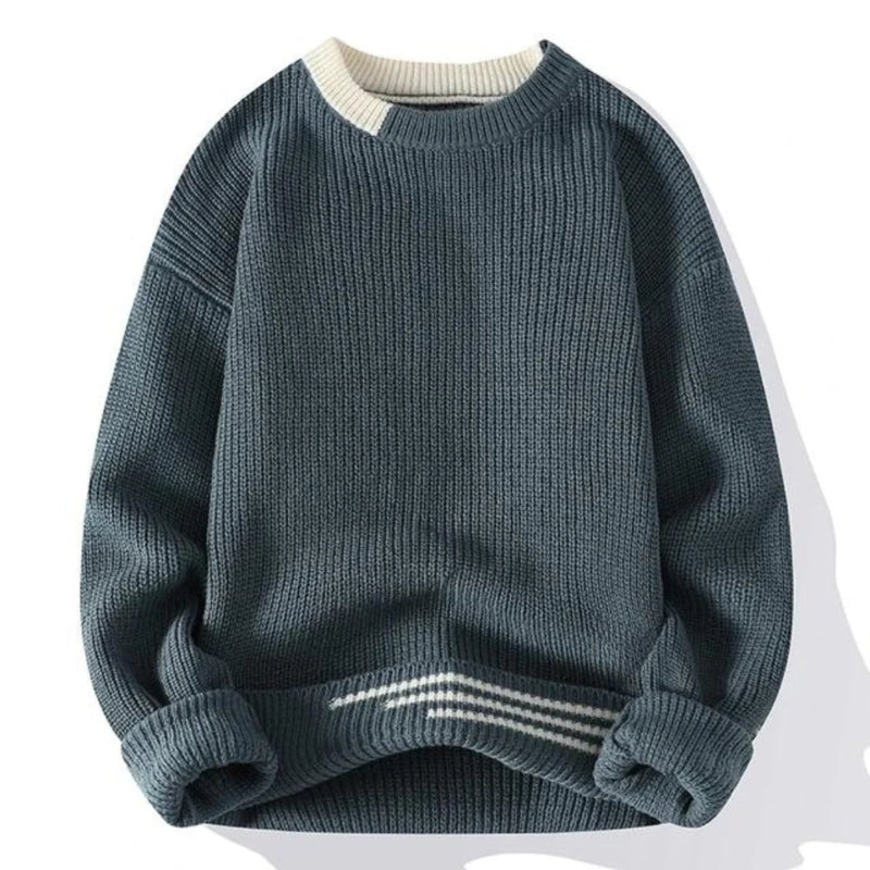 Deze trui heeft een ronde halslijn met een afstekende boord en een grofgebreid weefsel over het gehele kledingstuk. De onderzoom toont dwarse streepjes in een afwijkende tint. Een geweven merklapje zit bevestigd aan de linkerkant bij de onderzoom. De lange mouwen eindigen in geribbelde boorden.