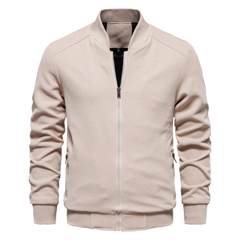 Deze jas heeft een volledige ritssluiting aan de voorkant met een opstaande kraag. De jas heeft schouderstukken, twee zakken met ritssluiting aan de zijkanten en lange mouwen. De boorden en zoom zijn afgewerkt met ribbels.