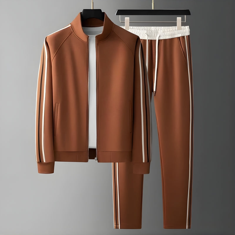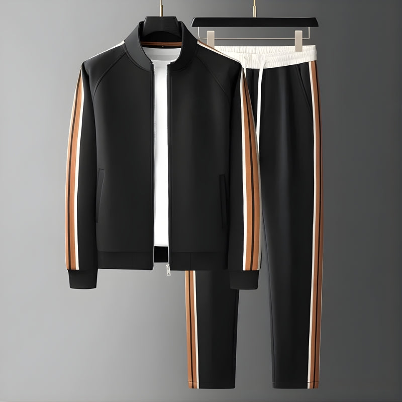 Dit trainingspak bestaat uit een jasje en een bijpassende broek. Het jasje heeft een opstaande kraag en sluit aan de voorkant met een rits. De mouwuiteinden en de onderzoom zijn afgewerkt met geribde boorden. De broek heeft een elastische tailleband en langs beide broekspijpen lopen dezelfde verticale strepen.