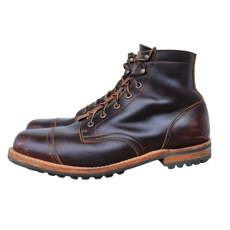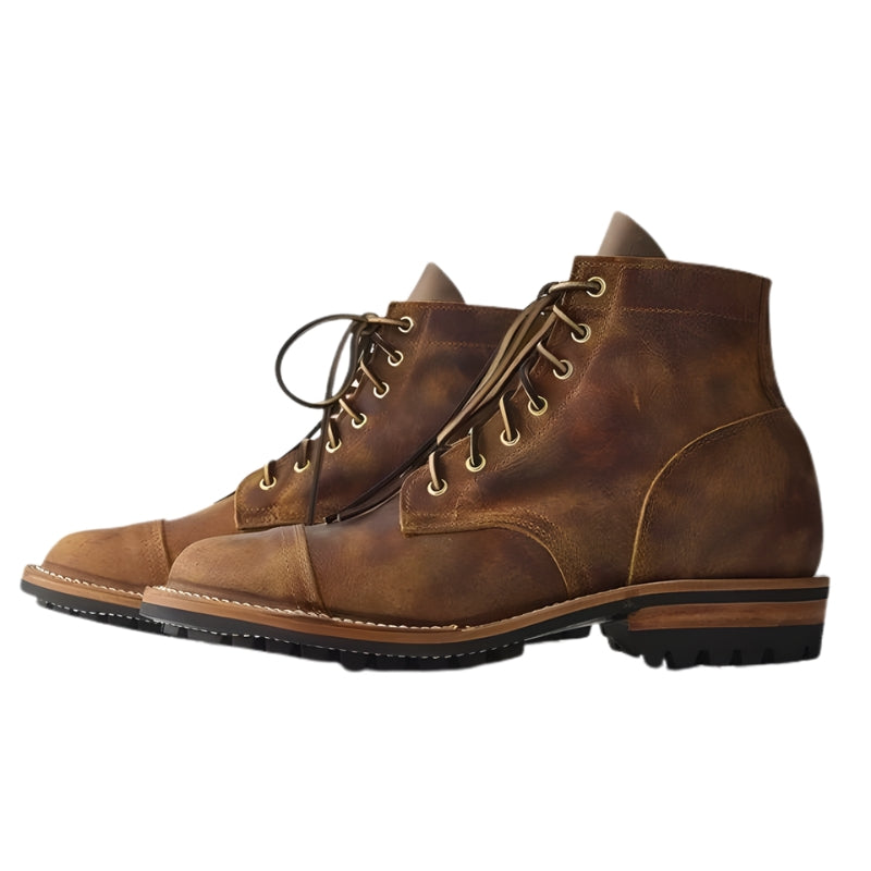 Deze enkellaarsjes hebben een veter-sluiting met oogjes. Ze zijn voorzien van een ronde neus en een profielzool met een groevenpatroon. Het stiksel en het hielstuk geven ze een klassieke werklaars-stijl.