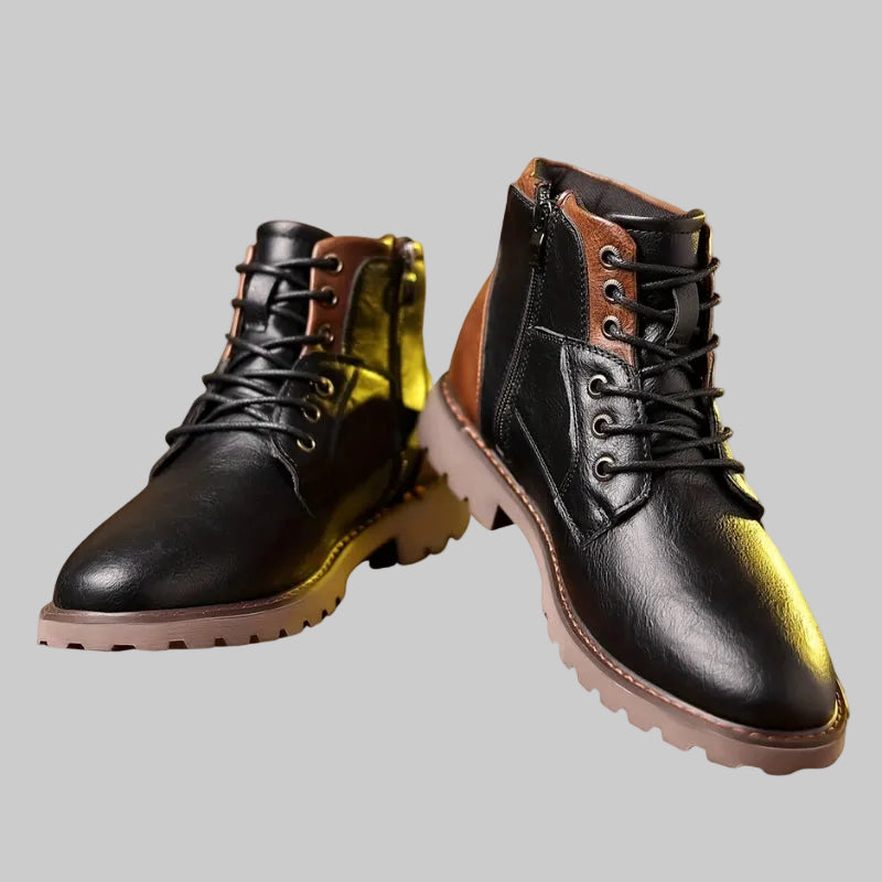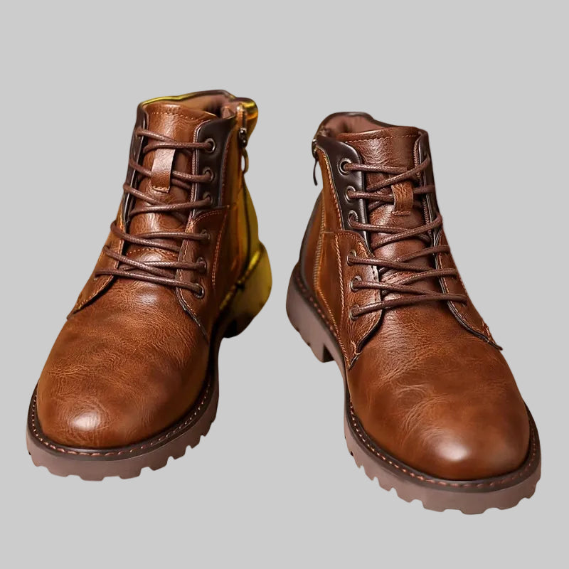 Deze hoge veterlaars heeft een gesloten vetersluiting met zes vetergaatjes en een zijrits voor snel aan- en uittrekken. De laars reikt tot boven de enkel en heeft een verhoogde schacht. Sierstiksels en reliëfdetails sieren de buitenzijde.
