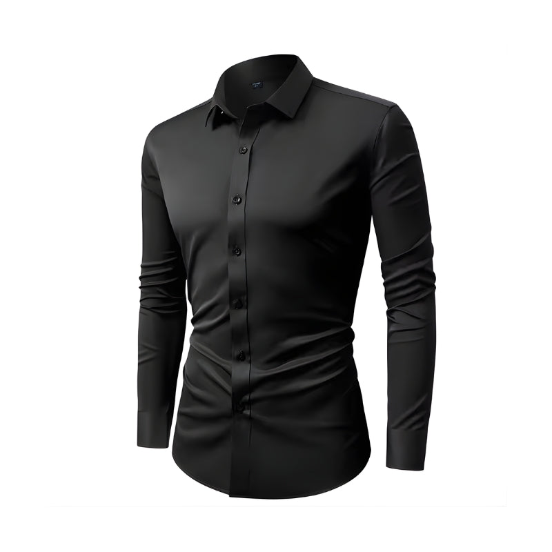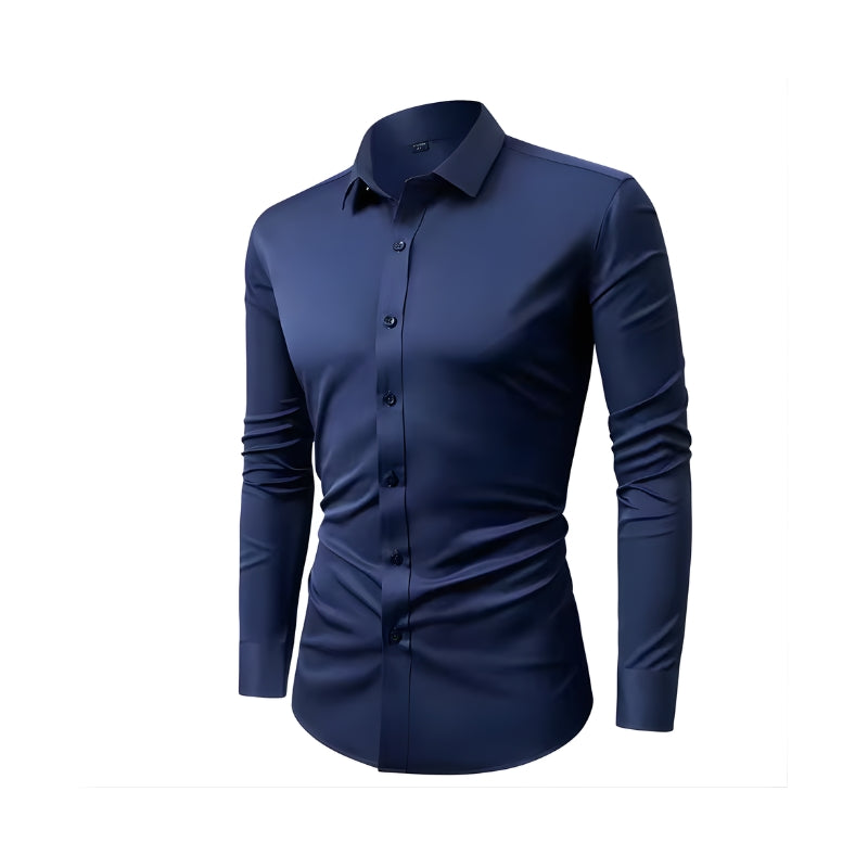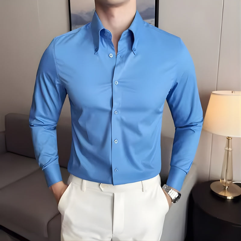 Dit overhemd heeft een aansluitende pasvorm die de bovenlichaamslijn volgt. De klassieke puntkraag en de volledige knoopsluiting aan de voorkant zorgen voor een verzorgde uitstraling. De lange mouwen hebben manchetten met een enkele knoopsluiting.