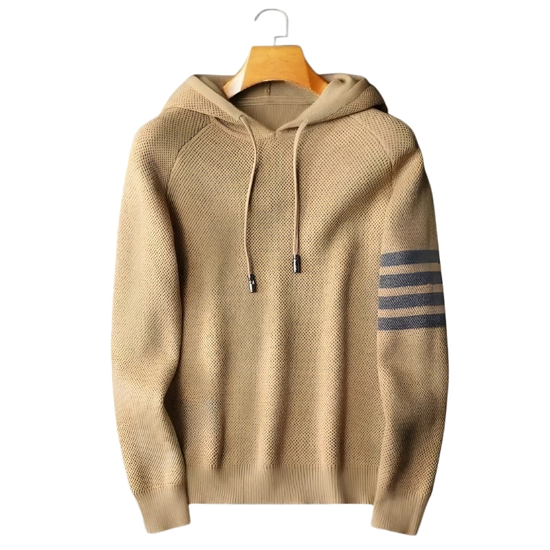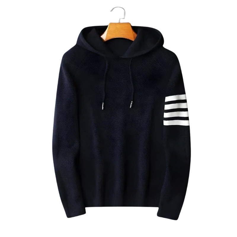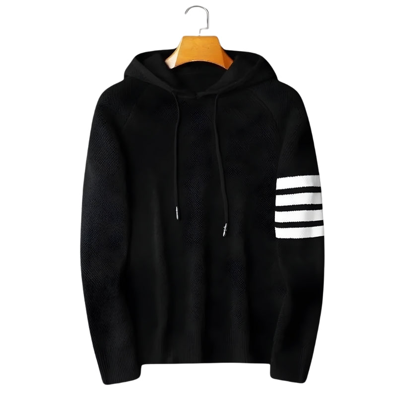 Deze gebreide trui heeft een capuchon met trekkoord voor verstelling. Op de rechtermouw lopen horizontale strepen die voor een grafisch accent zorgen. De mouwen en zoom hebben geribbelde boorden voor een nette afwerking.