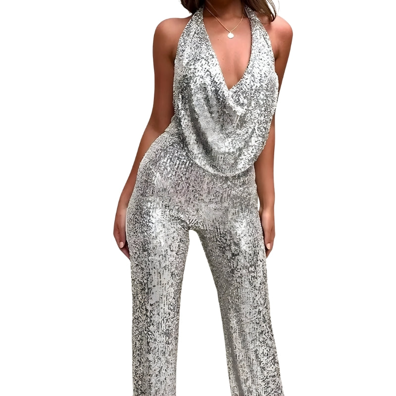 Dit eendelige pak heeft een oppervlak dat volledig is bedekt met lovertjes. De haltersluiting loopt achter in de nek en het voorpand heeft een diepe V-hals. De broekspijpen zijn lang en wijd met een rechte pasvorm vanaf de heupen.
