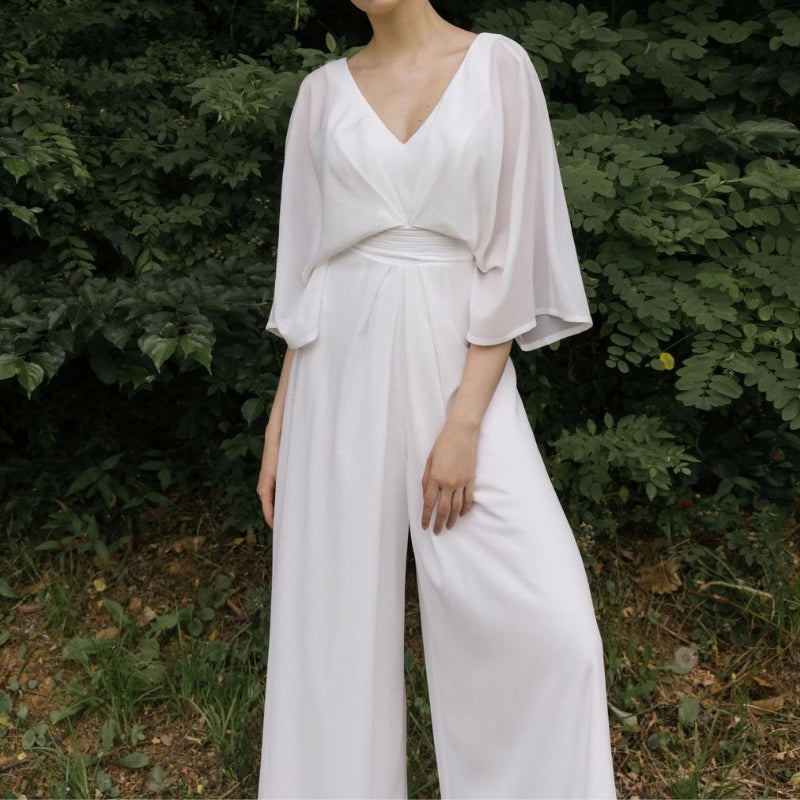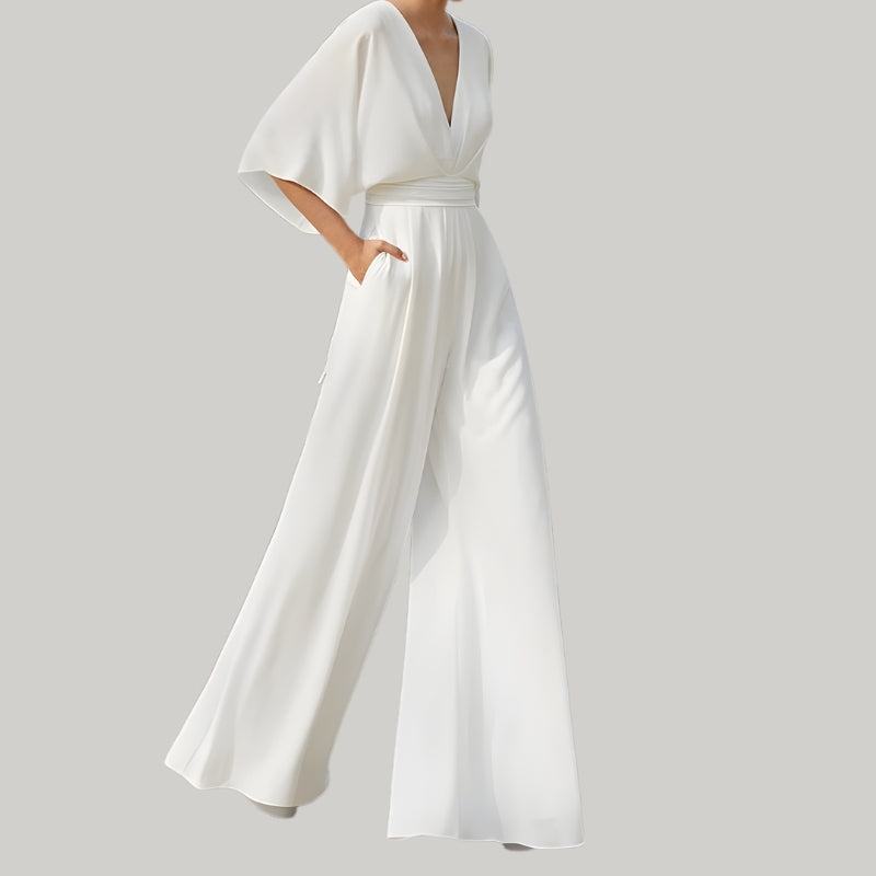 Dit broekpak heeft een wikkelmodel met een diepe V-hals die aan de voorkant overlapt. Het kledingstuk is voorzien van korte vleermuismouwen die wijd vallen. De tailleband loopt rondom het midden en accentueert de taille, terwijl de broekspijpen recht naar beneden vallen tot op de grond.