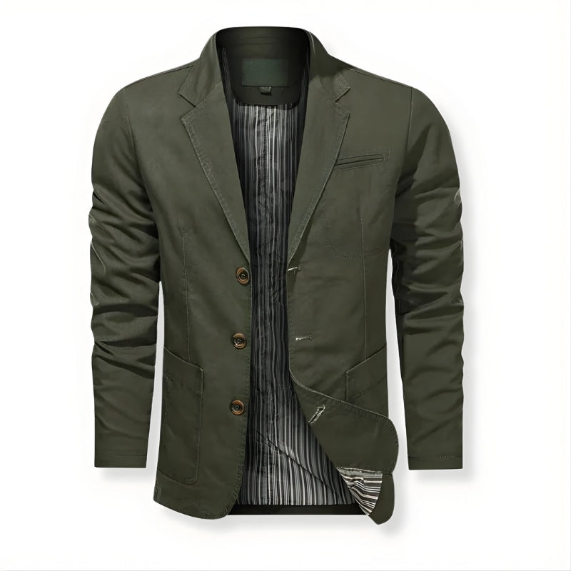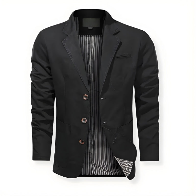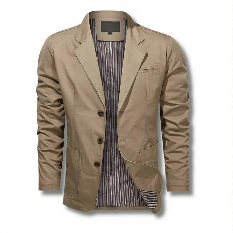 Dit colbert heeft een kraagomslag met inkeping en sluit met drie knopen aan de voorkant. Het colbert heeft een borstzak aan de linkerkant en twee zakken aan de onderzijde. De binnenkant heeft een gestreepte voering die zichtbaar is wanneer het jasje open staat.