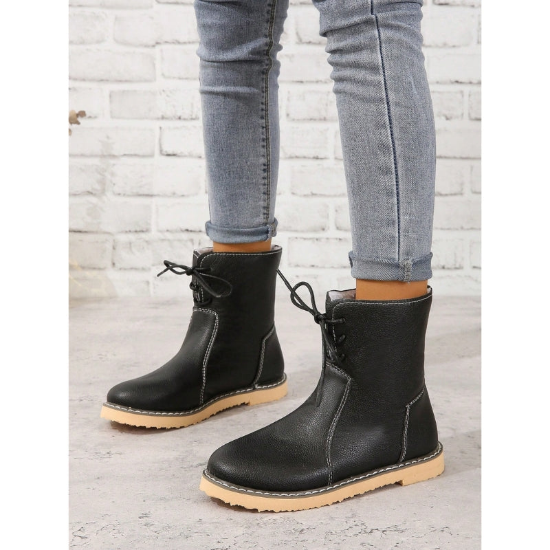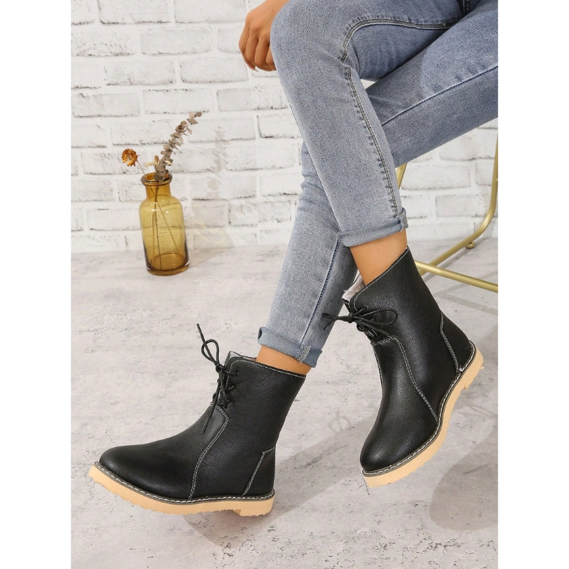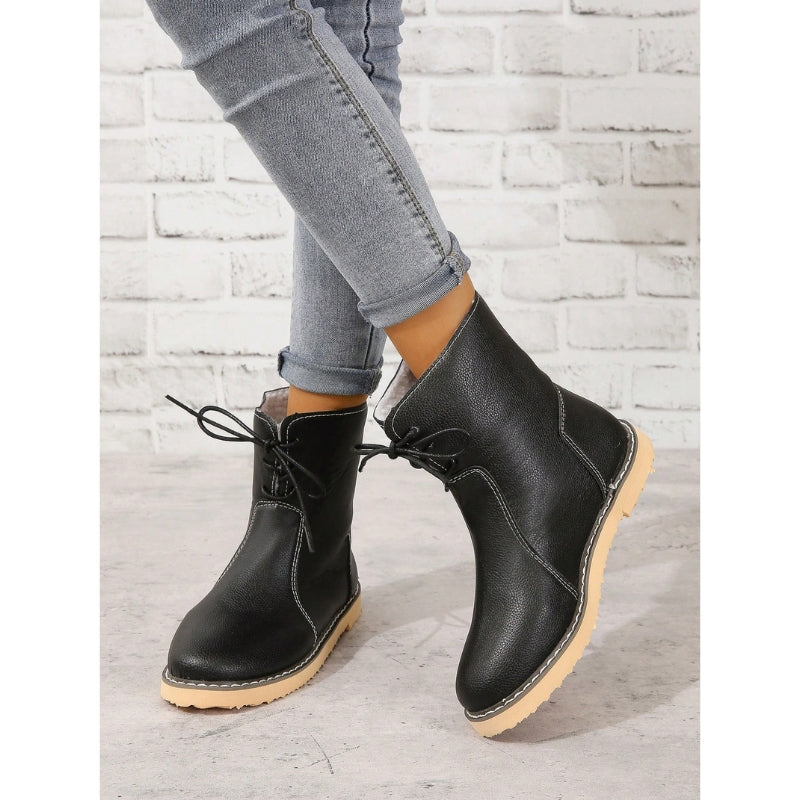 Deze enkellaarsen hebben een vetersluiting aan de zijkant en contrasterende stiksels rondom. De platte zool heeft een groefpatroon voor extra grip. Het model reikt tot de enkel en heeft een ronde neus.