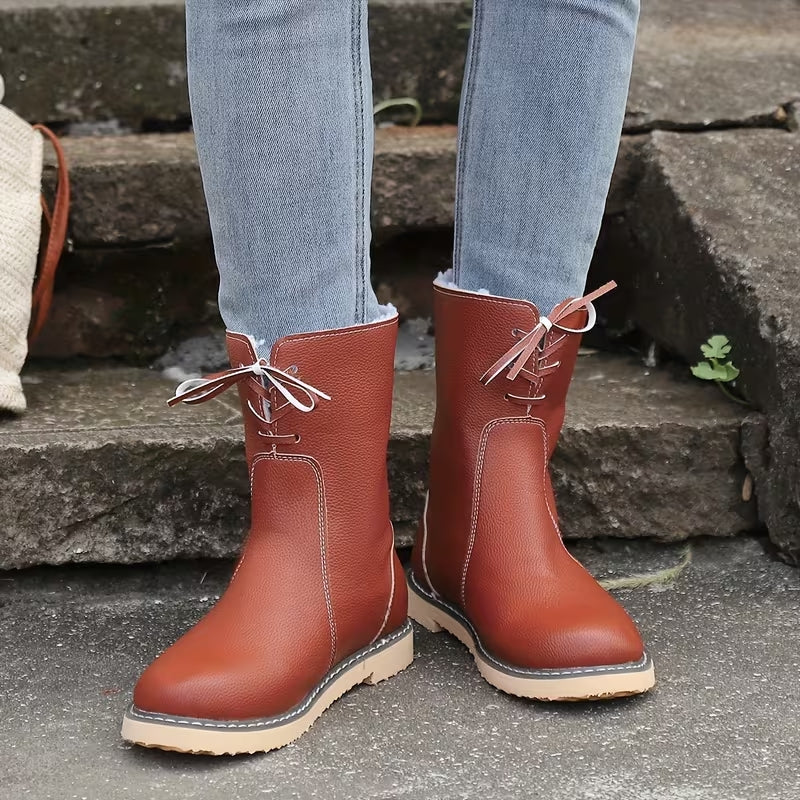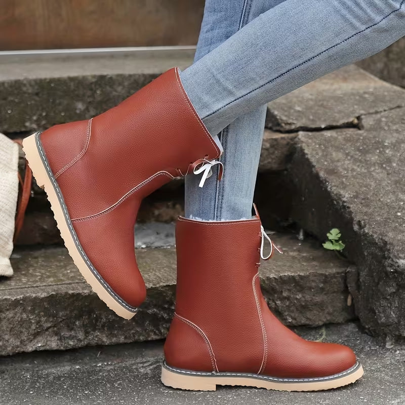 Dames enkellaarsen met vetersluiting en contrasterende stiksels