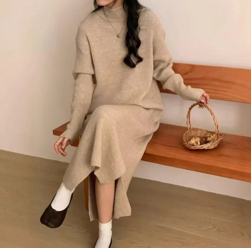 Dames gebreide jurk coltrui geribbeld lange mouwen