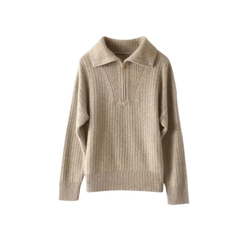 Deze damestrui met halve rits heeft een reverskraag en lange mouwen. De relaxte pasvorm biedt warmte en bedekking tijdens de koudere maanden. Verkrijgbaar in neutrale kleuren en goed te combineren met jeans, rokken en alle wintergarderobe-essentials voor dames.