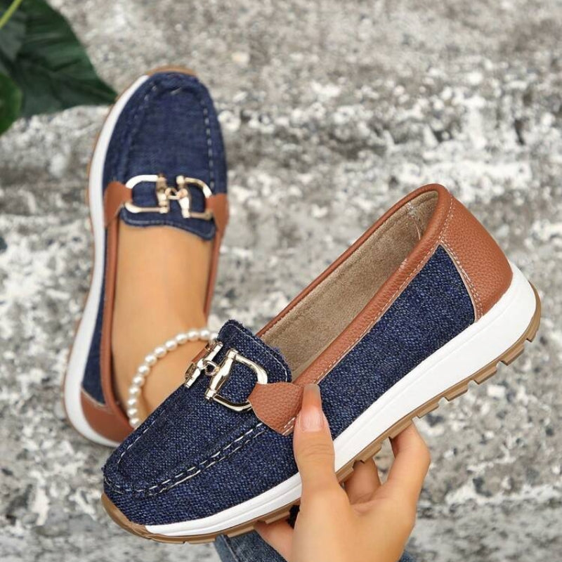Deze instappers hebben een bovenwerk met verschillende stiknaden. Over de voorkant loopt een brede band met een gesp als versiering. De schoenen hebben geen veters en zijn aan de zijkanten en bij de hiel voorzien van inzetstukken in een afwijkende stijl.
