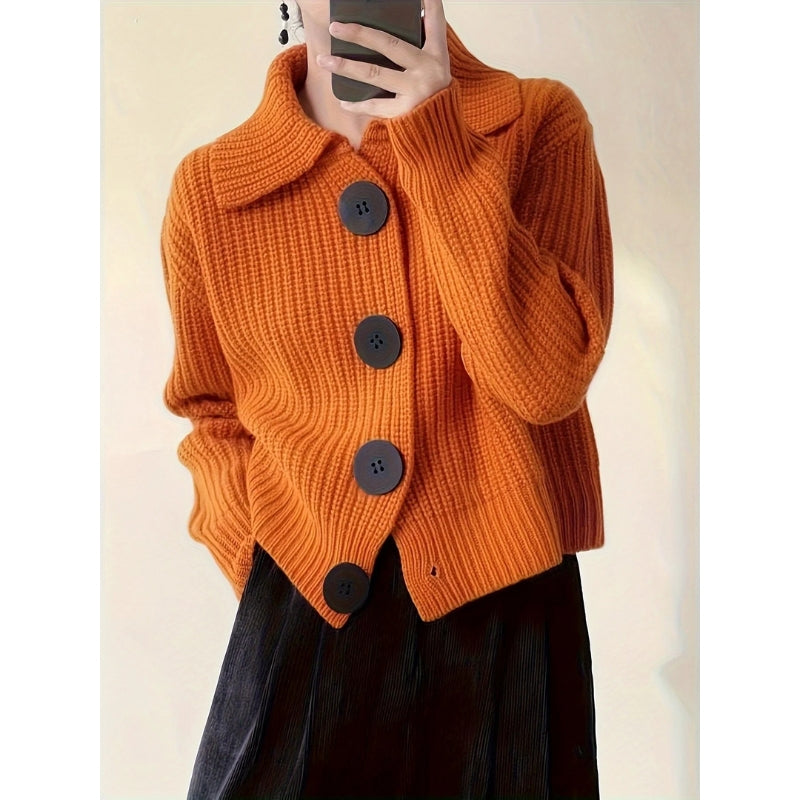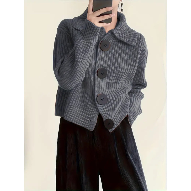 Deze gebreide jas heeft een opstaande ronde kraag die de hals mooi omlijst. Het kledingstuk sluit aan de voorkant met vier grote ronde knopen. De geribbelde structuur loopt verticaal over het hele ontwerp en heeft een duidelijk patroon. De jas valt tot net onder de taille en heeft lange mouwen met geribbelde manchetten.
