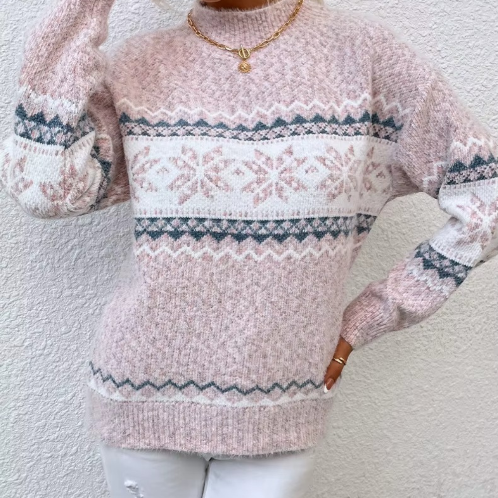 Deze coltrui voor dames heeft een winterdessin en is ideaal voor de koudere maanden. Het model met lange mouwen heeft een normale pasvorm en kan goed worden gecombineerd met laagjes. De hoge halslijn biedt extra warmte, terwijl het dessin een seizoensgebonden uitstraling geeft die ook past bij feestelijke momenten.