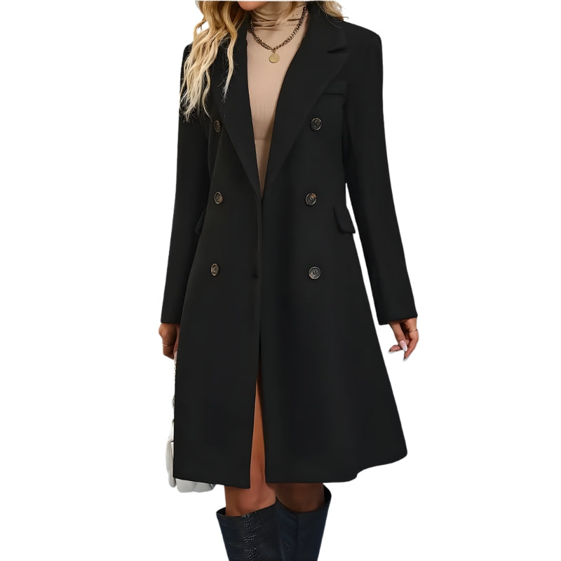 Lange jas met twee rijen knopen en brede revers